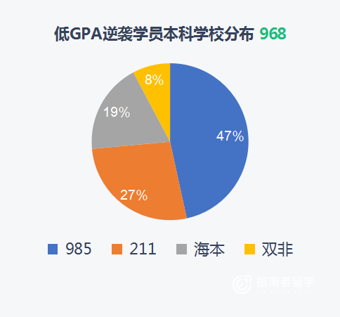 我们再来看一下这些低GPA逆袭选手的本科学校分布:近50%的学员来自985,27%的学员来自211,19%来自海本/中外合办性质的院校,只有8%的学员来自双非学校。不得不承认的是,没有本科学校的优势,“双非+低GPA”想要逆袭名校会异常艰难,双非同学一定要在GPA甚至其他方面做的更加出色才行。