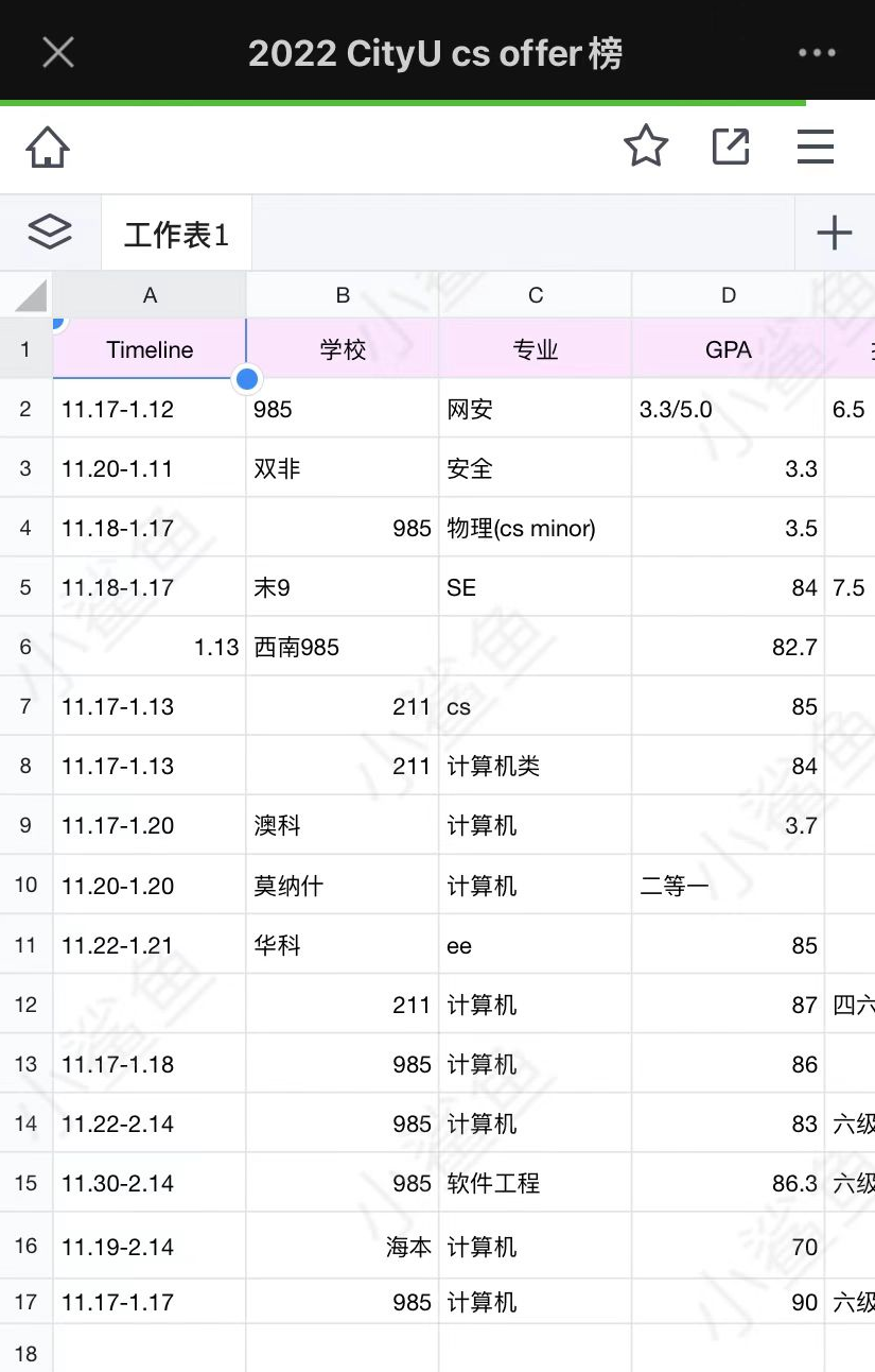 4、这周有学员给我们分享了一张港城大CS的录取学生背景,感兴趣的同学可以对比一下自己的条件: