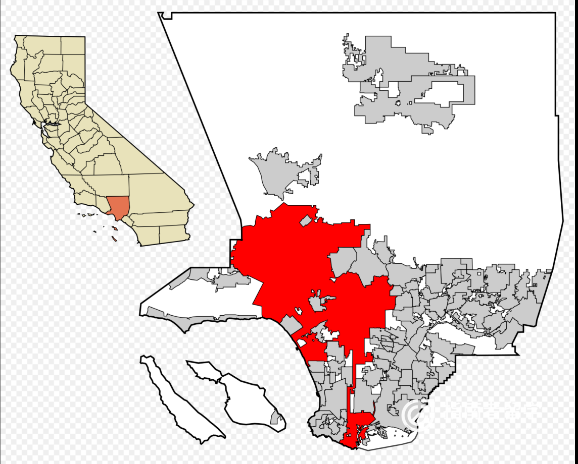(橘黄色部分为洛杉矶在加州洛杉矶县的位置)