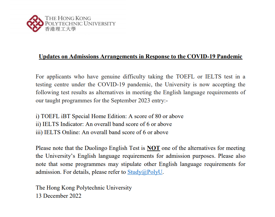 香港理工大学近日公布承认线上语言成绩,包括托福在线、雅思在线、雅思indicator,需要注意的是不接受多邻国。