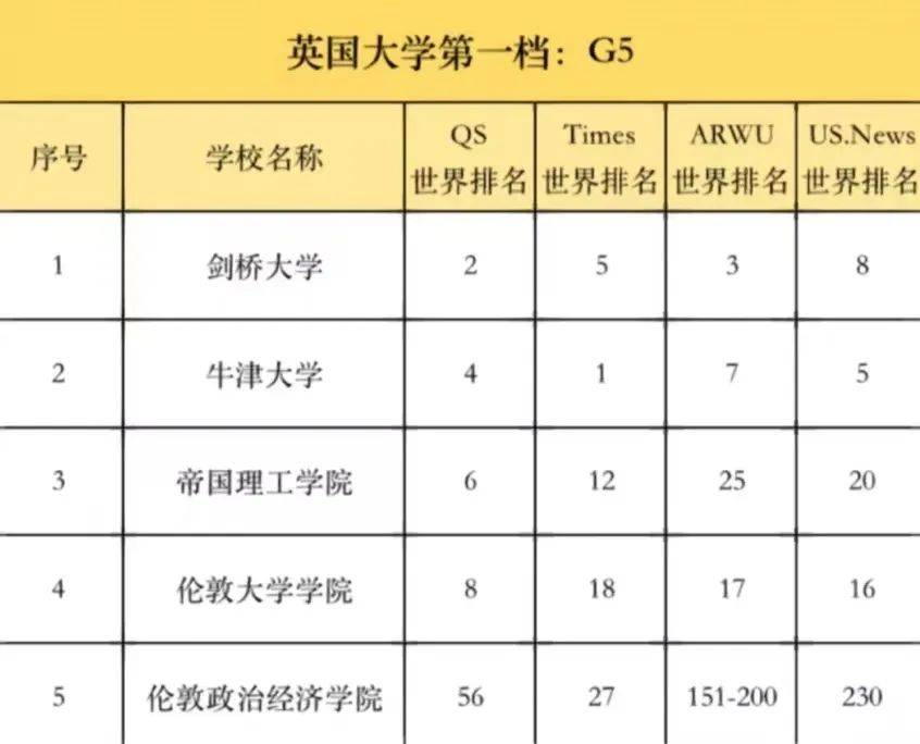 根据2023QS世界大学排行榜,剑桥大学排名全球第2,牛津大学第4,帝国理工学院第6,伦敦大学学院第8,伦敦政治经济学院虽然QS排名上稍显逊色,但无论是金融界,还是政商界,LSE的名气都非常大,毕业生平均起薪也是英国大学中最高的。毫无疑问,G5就是英国院校天花板。
