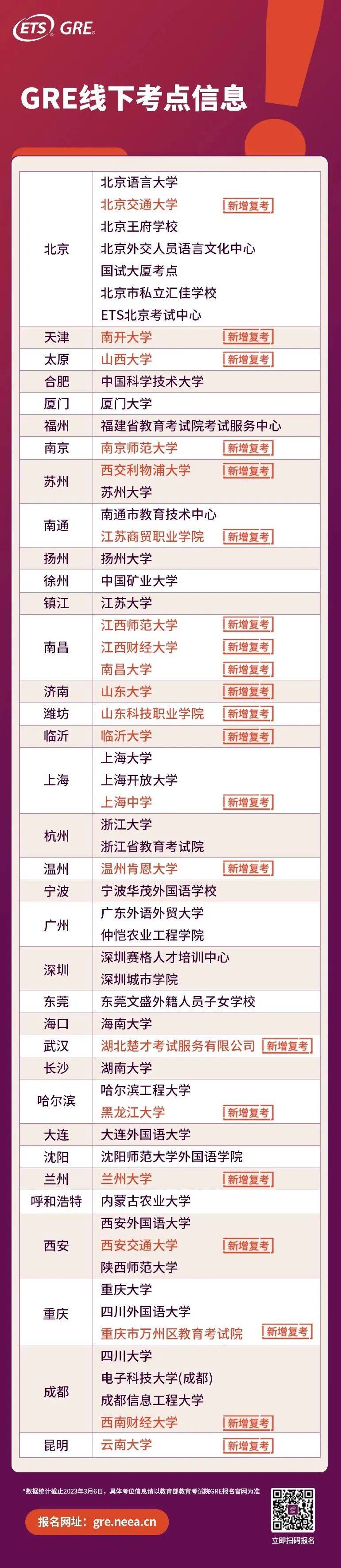 目前全国35个城市共有58个GRE普通考试考点开放,考位充足!