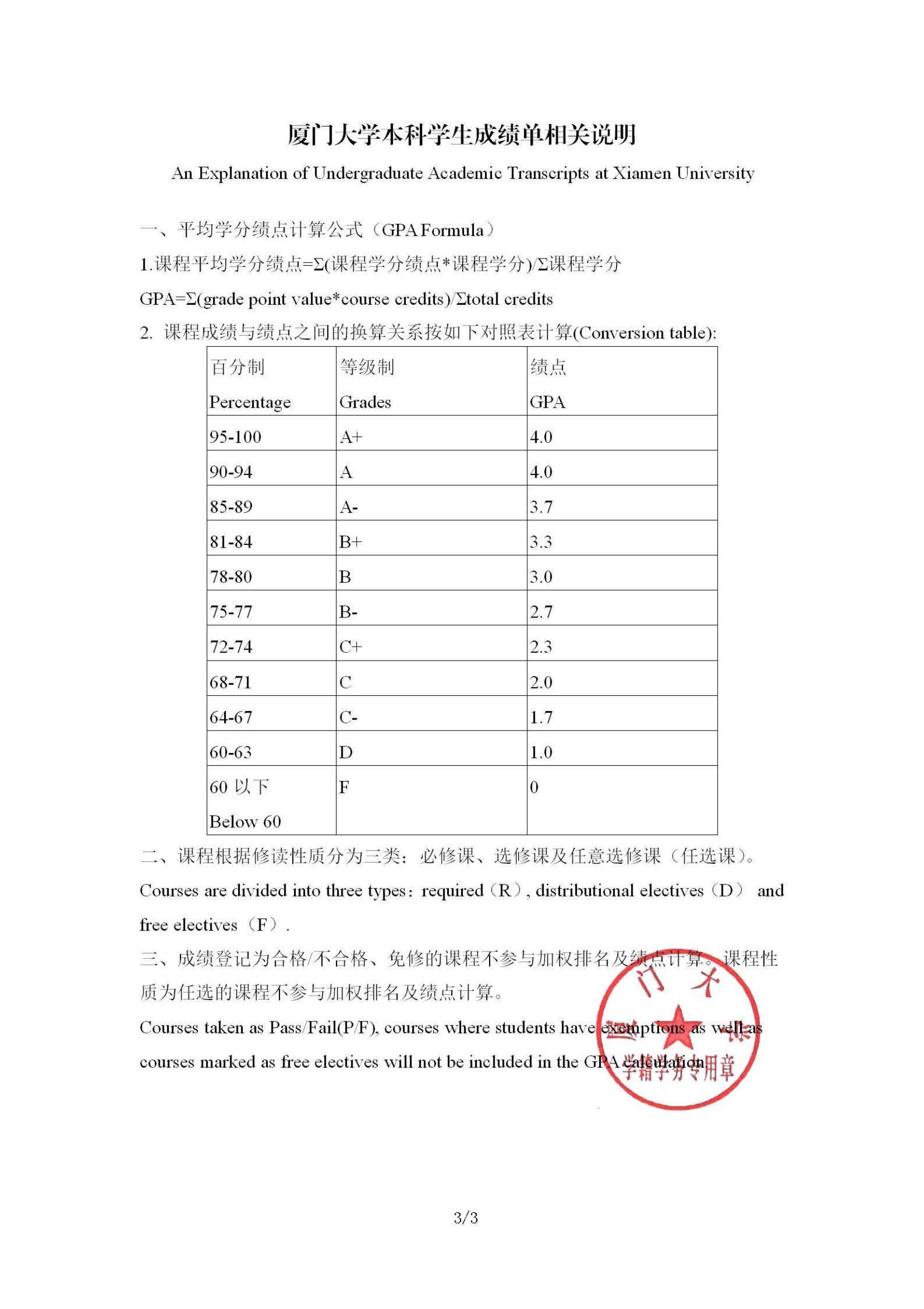 注意,厦门大学的学分绩点换算标准具体显示在成绩背面(见下图),学生在申请出国留学时直接提供官方成绩单即可,无需另外开具学分绩点换算标准文件。