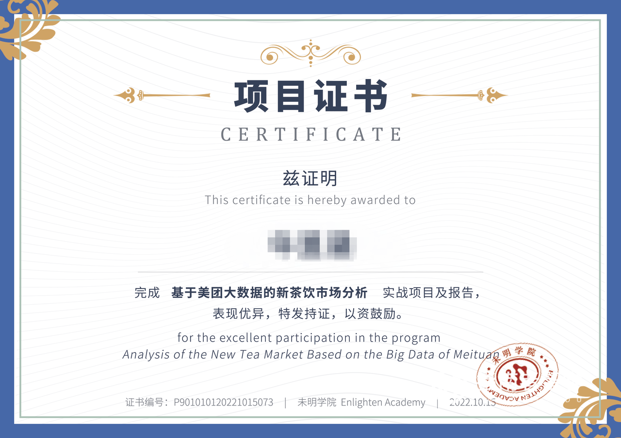 N同学本科专业是财务管理,有过Java的编程基础,未来想要申请海外经济和管理类专业的研究生,因此想增加一些数据分析和商业管理相关的知识和技能,为以后的申请积累高含金量的简历经历,因此N同学选择了商业数据分析实战项目。该同学所选的项目是国际和国内知名度非常高的美团,研究对象是当下年轻人最喜欢的新茶饮,包含了很多茶饮商品的销售数据和文本数据,同时项目中也用到了python和量化分析的方法,因此是一个高含金量的研究项目。从最后呈现的项目报告,我们可以看到N同学对数据分析有较好的知识与技能储备: