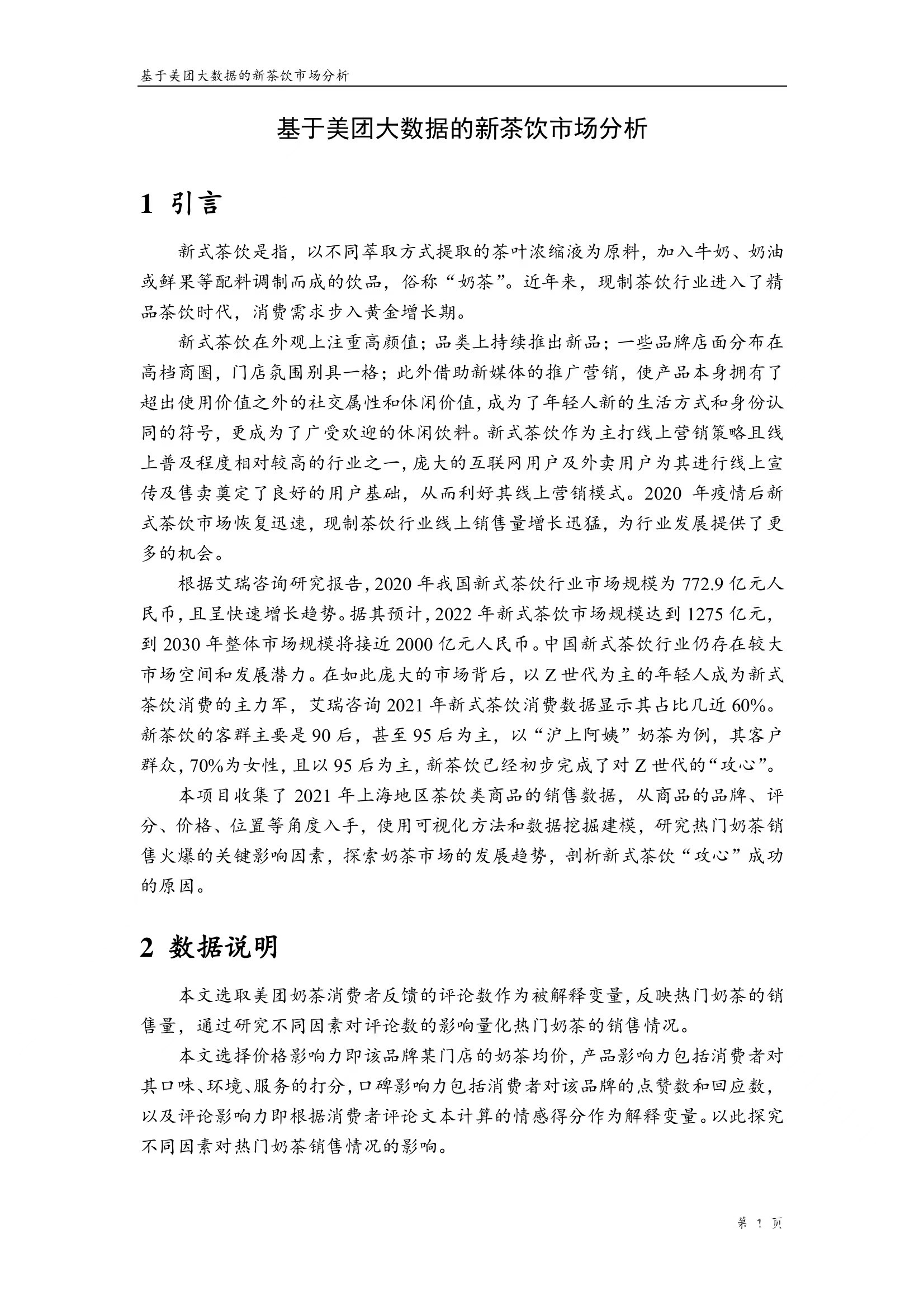 本项目收集了2021年上海地区茶饮类商品的销售数据,从商品的品牌、评分、价格、位置等个角度入手,使用可视化方法和数据挖掘建模,研究热门奶茶销售火爆的关键影响因素,探索奶茶市场的发展趋势,剖析新式茶饮“攻心”成功的原因。