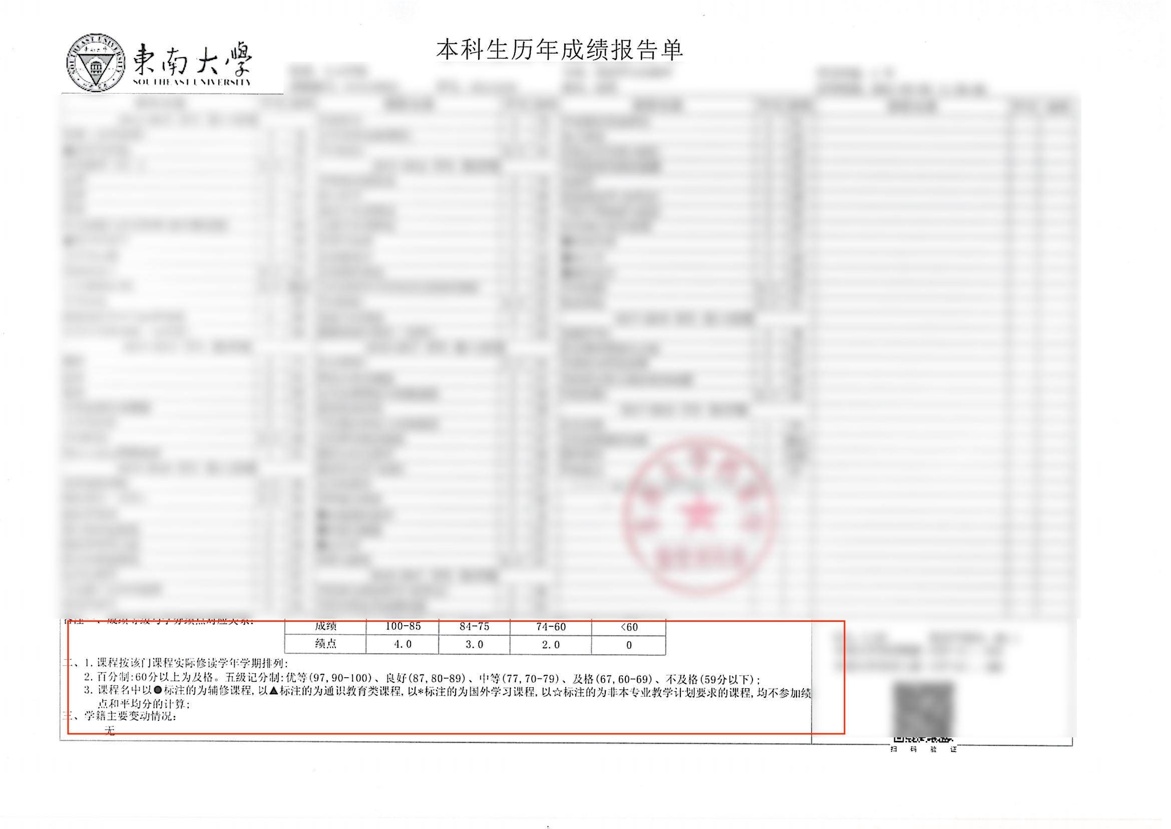 注意,东南大学的学分绩点换算标准具体显示在成绩底部(见下图),学生在申请出国留学时直接提供官方成绩单即可,无需另外开具学分绩点换算标准文件。