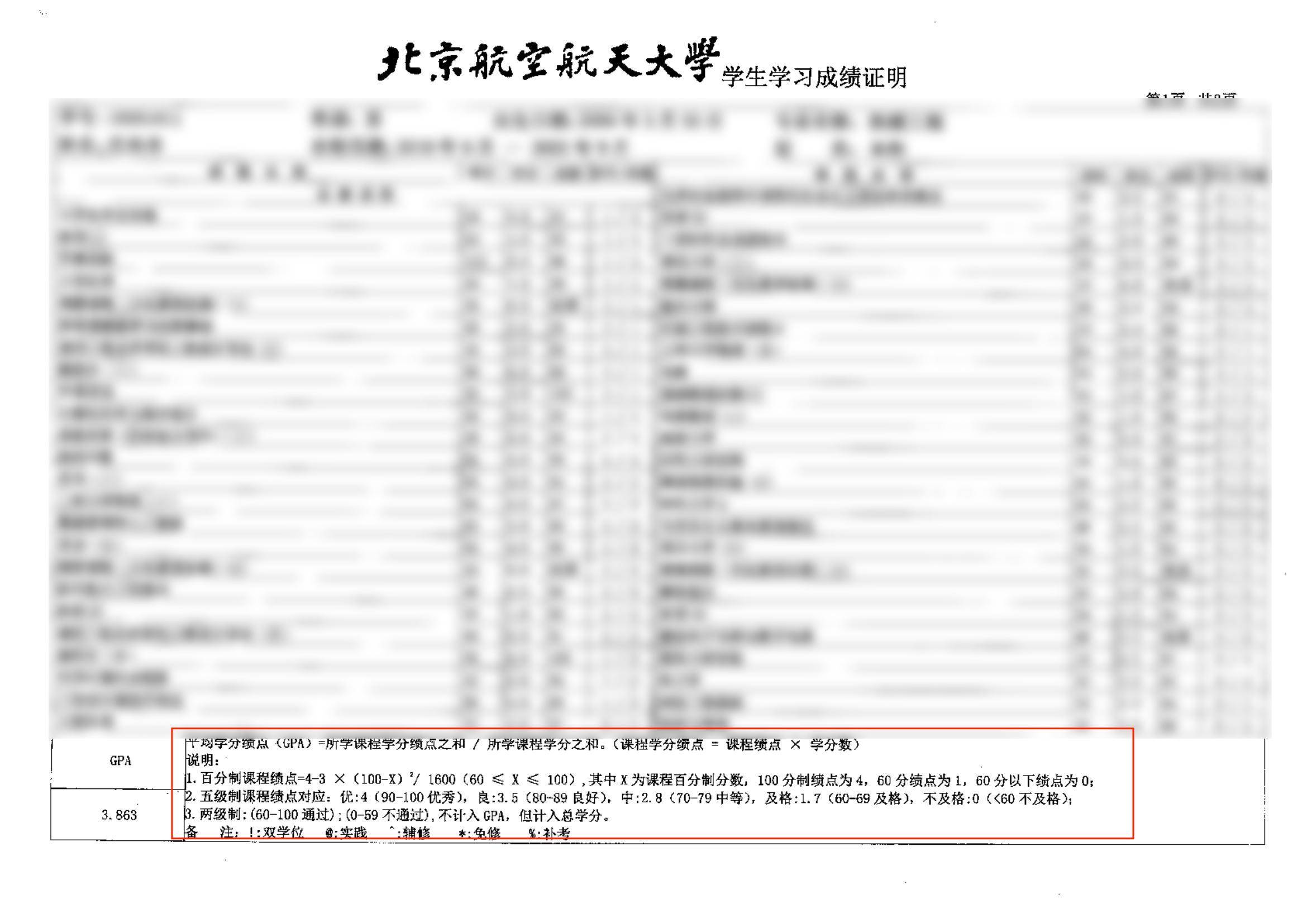 注意,北京航空航天大学的学分绩点换算标准具体显示在成绩底部(见下图),学生在申请出国留学时直接提供官方成绩单即可,无需另外开具学分绩点换算标准文件。