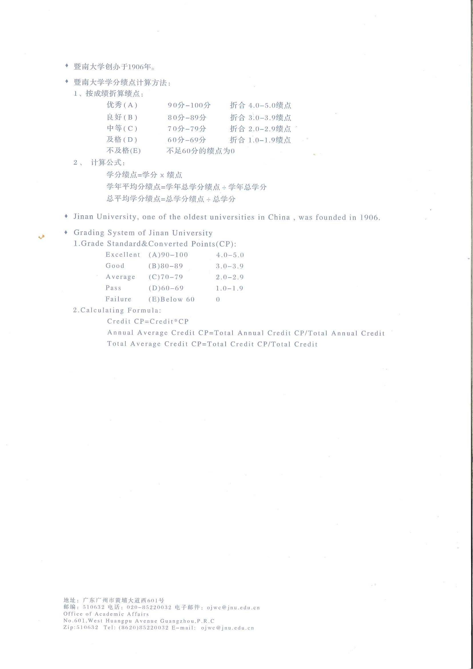 注意,暨南大学的学分绩点换算标准具体显示在成绩背面(见下图),学生在申请出国留学时直接提供官方成绩单即可,无需另外开具学分绩点换算标准文件。