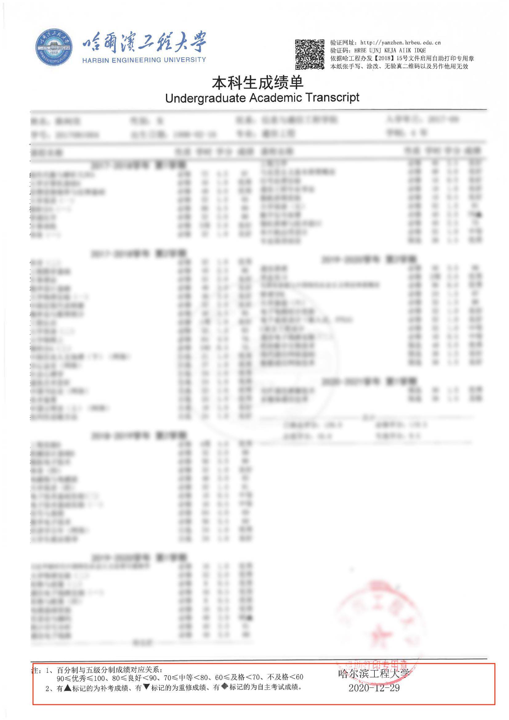 注意,哈尔滨工程大学的学分绩点换算标准具体显示在成绩底部(见下图),学生在申请出国留学时直接提供官方成绩单即可,无需另外开具学分绩点换算标准文件。