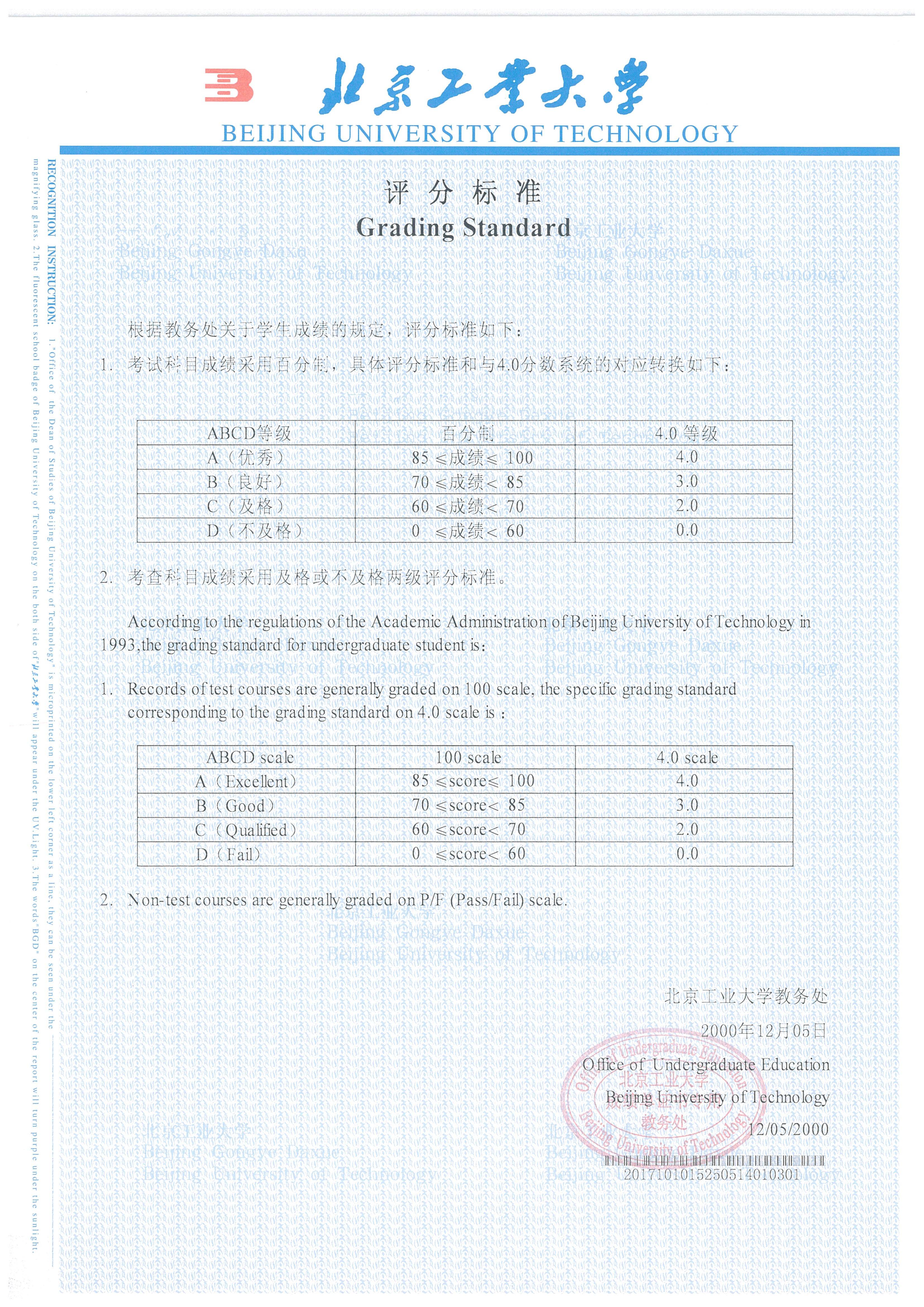 注意,北京工业大学的学分绩点换算标准具体显示在成绩背面(见下图),学生在申请出国留学时直接提供官方成绩单即可,无需另外开具学分绩点换算标准文件。