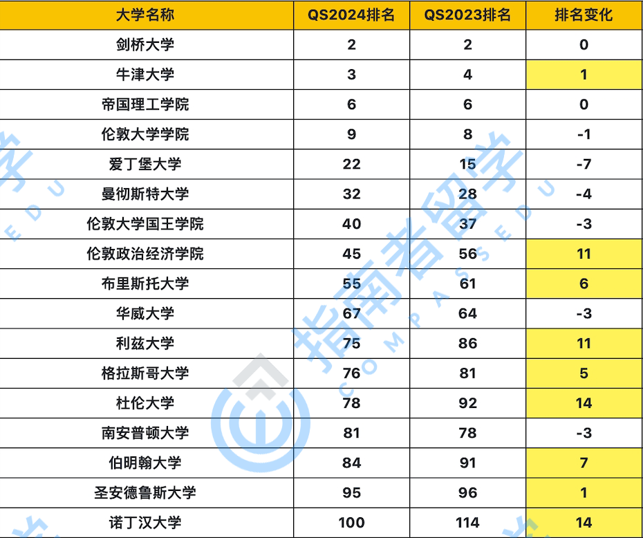 剑桥大学、牛津大学、帝国理工学院、UCL分别位于第2、3、6、9名。王、爱、曼、华均有一定程度的下降,但下降幅度不大。LSE上升至45名。利兹大学、杜伦大学、伯明翰大学均有大幅上升,分别位于第75、78、84名。诺丁汉大学顺利挤进前100成为新任“守门员”,而谢菲尔德大学位于104,遗憾地暂时离开了Top 100区间。