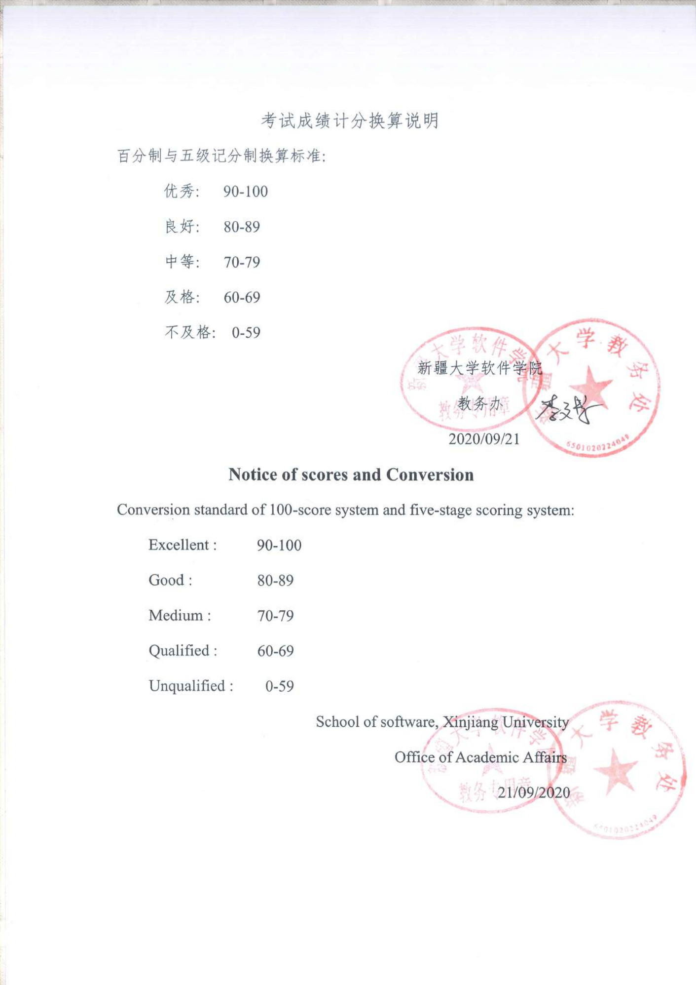 需要特别注意的是,新疆大学的学分绩点换算标准不体现在成绩单上,学生需另外开具百分制均分及学分绩点换算标准文件。