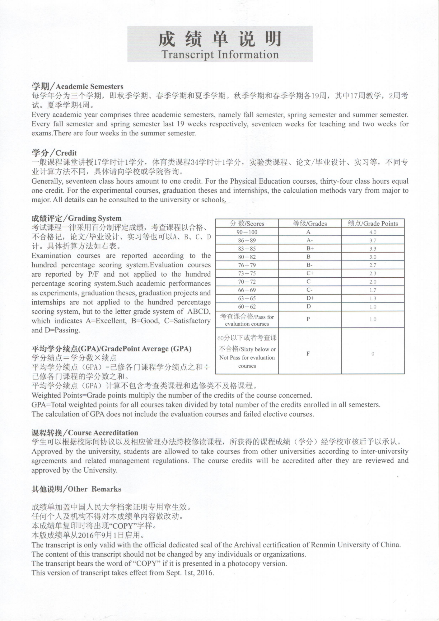 注意,中国人民大学(苏州)的学分绩点换算标准具体显示在成绩单背面(见下图),学生在申请出国留学时直接提供官方成绩单即可,无需另外开具学分绩点换算标准文件。