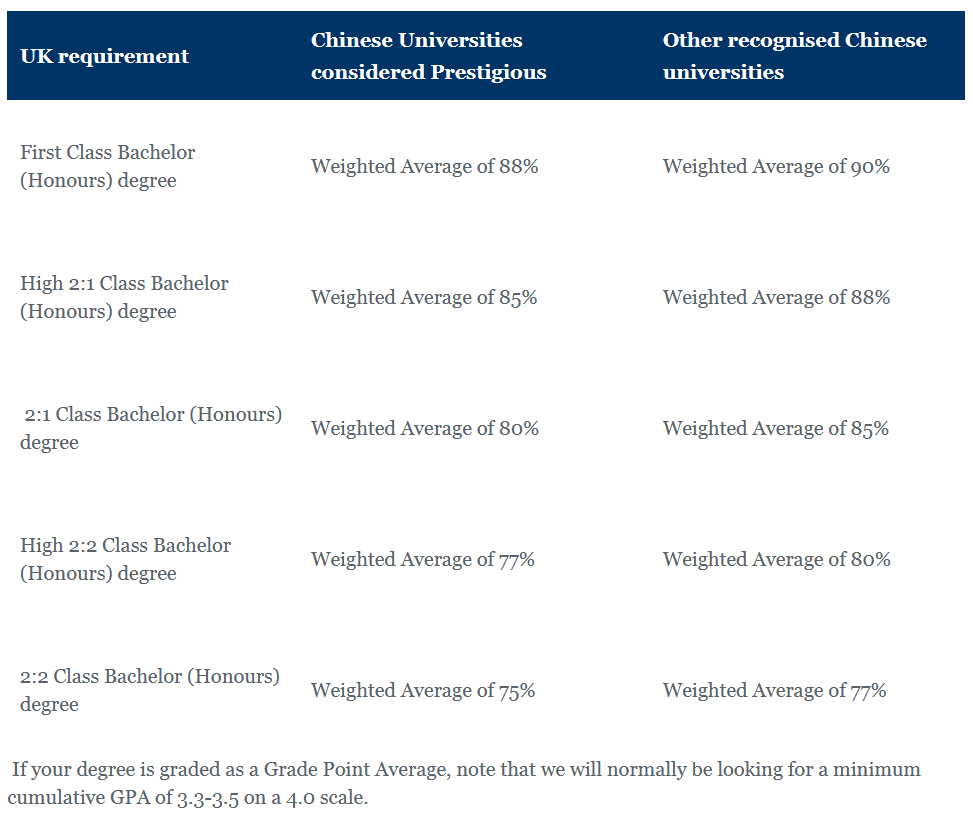 Prestigious Institutions:一等至二等二学位的要求分别为88%、85%、80%、77%、75%;