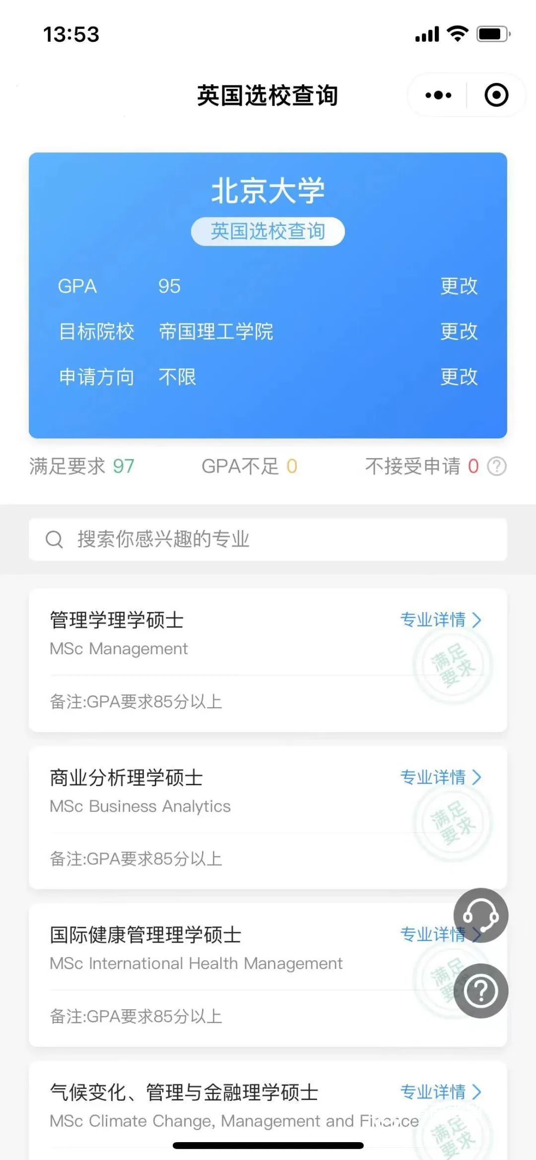 例如:输入本科院校“北京大学”、GPA95、目标院校“帝国理工学院”、申请方向“不限”,即可快速得知能够申请的所有专业方向。