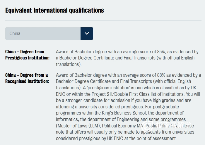 KCL则在此基础上对两类国内院校设置了不同的录取均分要求: