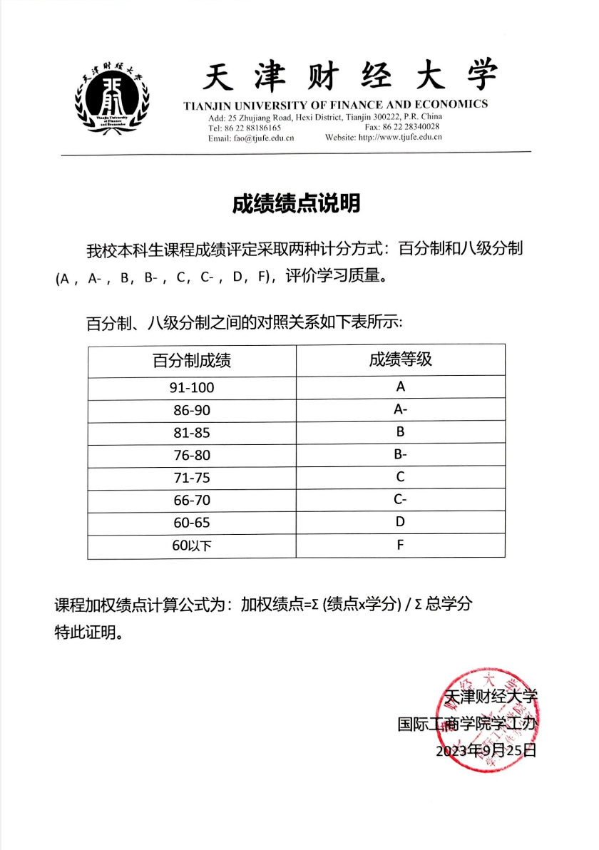 需要注意的是,天津财经大学的学分绩点换算标准不体现在成绩单上,学生需另外开具百分制均分及学分绩点换算标准文件。