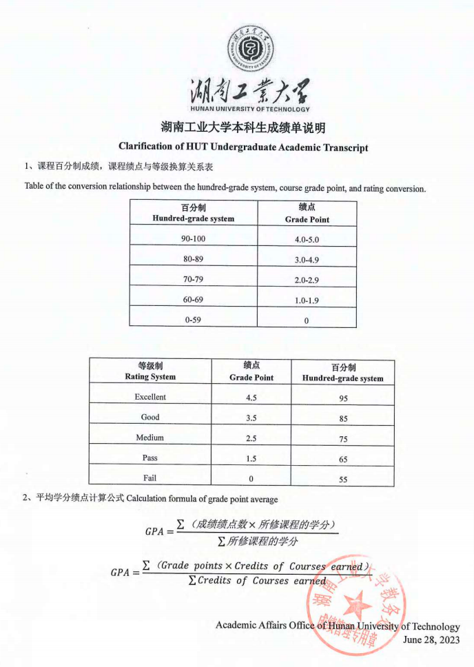 需要注意的是,湖南工业大学的学分绩点换算标准不体现在成绩单上,学生需另外开具百分制均分及学分绩点换算标准文件。