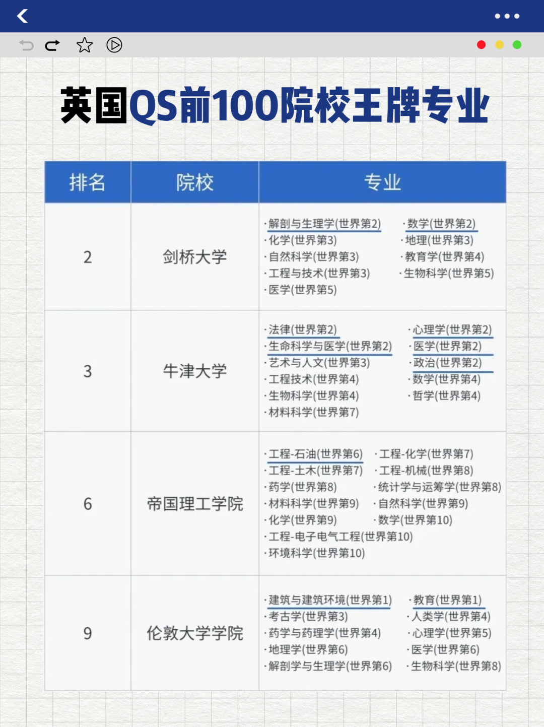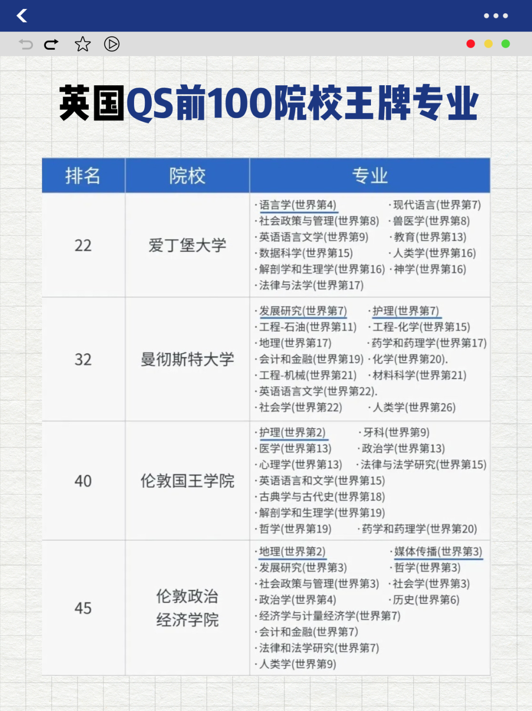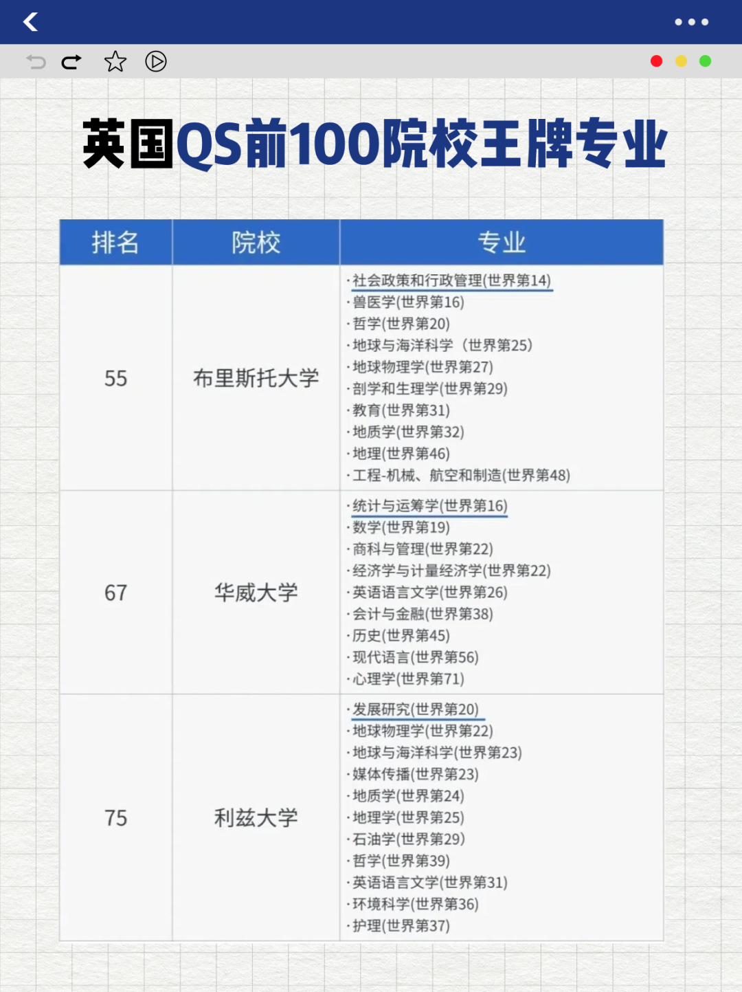 指南君为大家准备了英国QS前100院校的王牌专业,看看有没有你感兴趣的呢?而且小程序“指南者选校助手”还新增了“一键对比”功能,点击进入搜索任意专业即可~