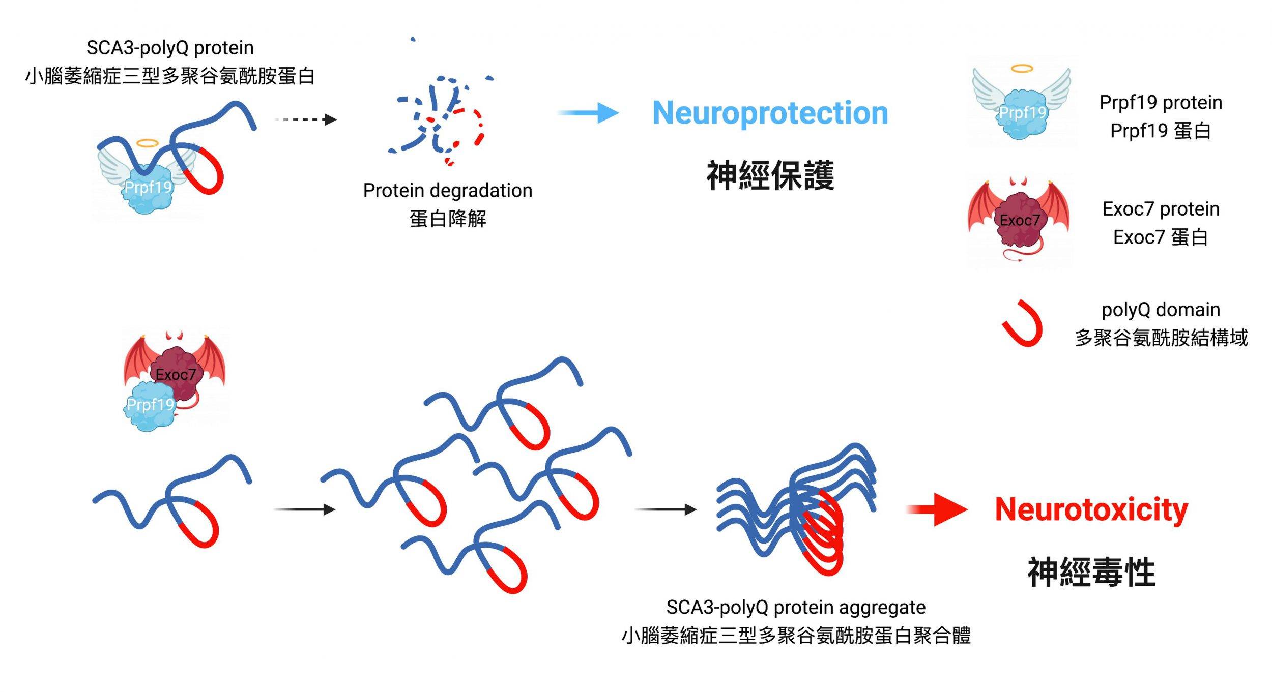 Exoc7蛋白负责控制细胞内蛋白质的运输,与Prpf19蛋白在执行多种细胞功能时起交互作用,而Exoc7蛋白的卷曲螺旋型蛋白结构是抑制Prpf19功能的关键部分。研究团队更发现,Exoc7会游走到细胞核,减低Prpf19对疾病蛋白的分解,并干扰pre-mRNA蛋白质剪接,导致Prpf19失去对小脑萎缩症三型模型神经退化的保护功能。