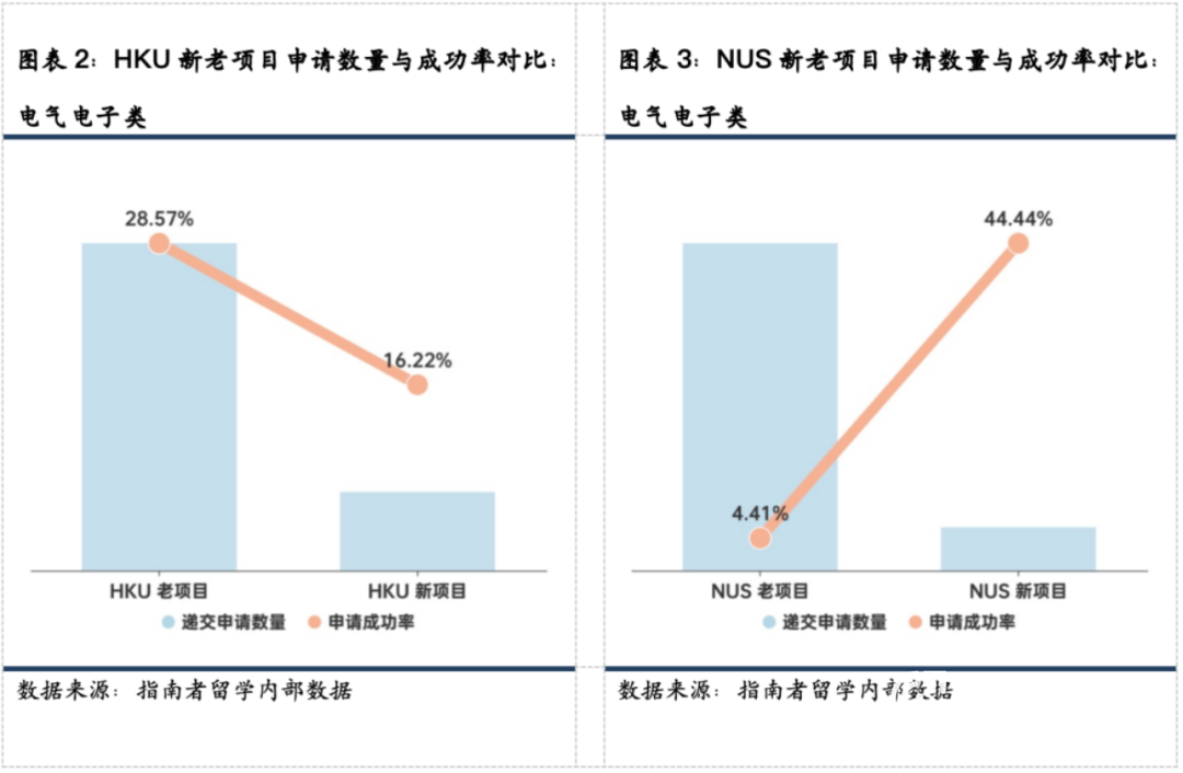 譬如,港新两大头部院校EE类项目的新开专业:港大的微电子科学与技术和新国立的半导体技术与运作,虽然两个新项目的申请人数都不是很多,但港大的录取率(16.22%)明显低于新国立(44.44%)。