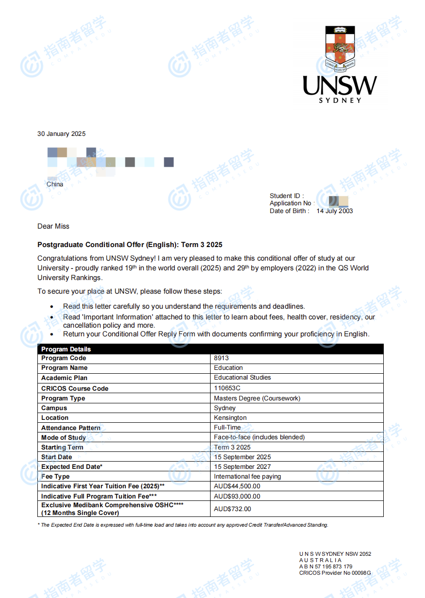 新南威尔士大学教育学硕士(教育研究)研究生offer一枚