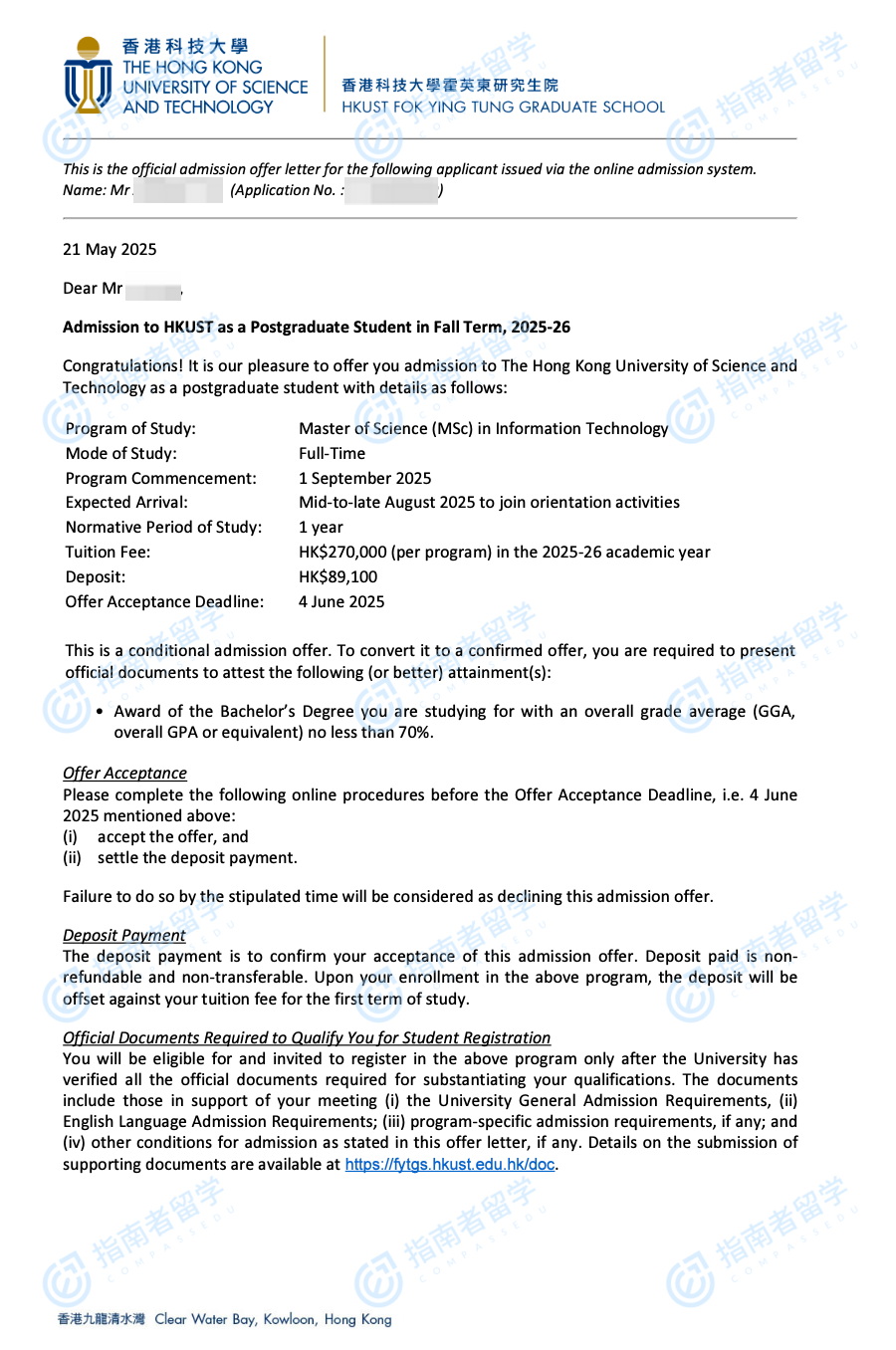 香港科技大学信息技术理学硕士研究生offer一枚