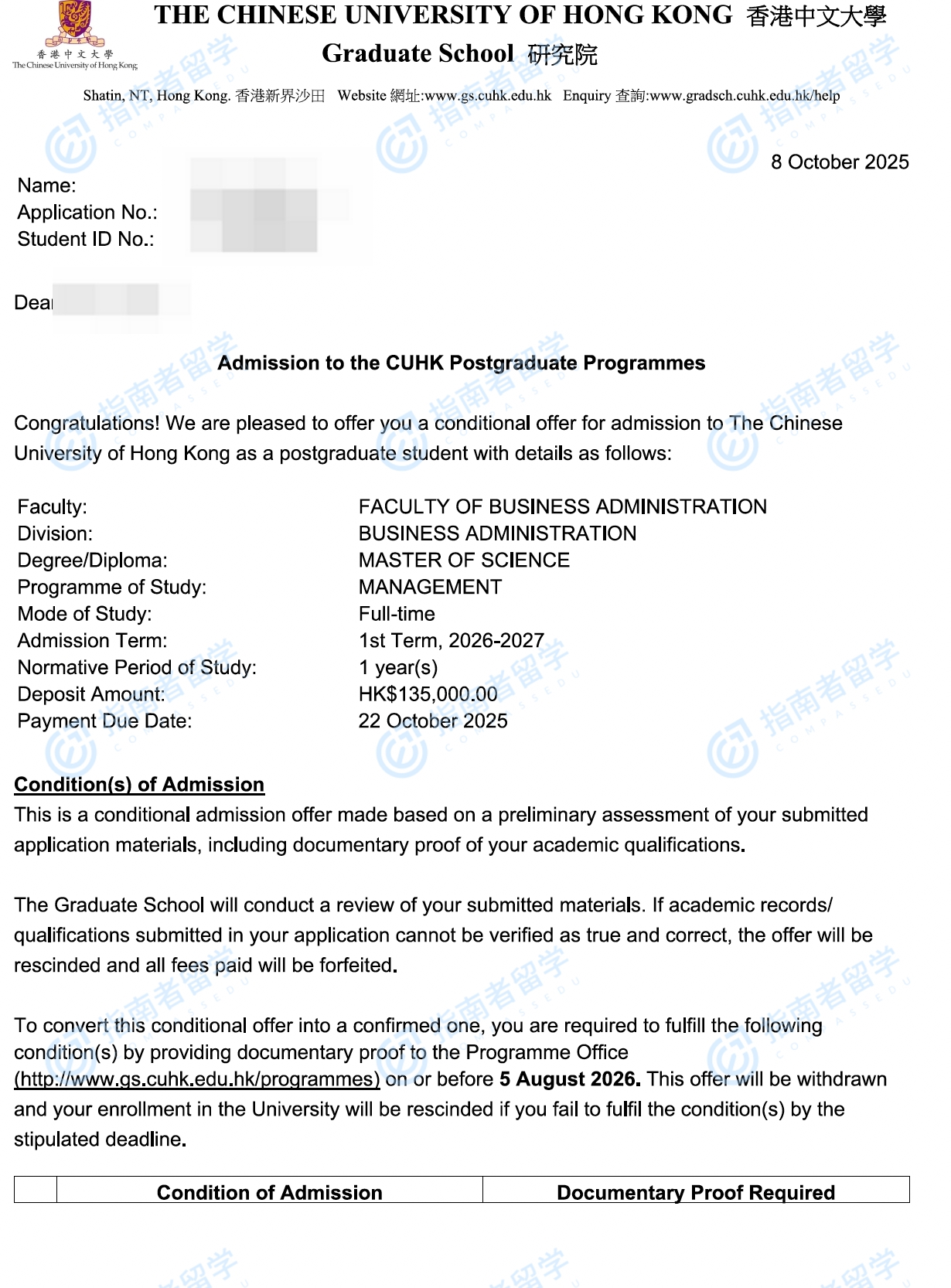 香港中文大学管理学理学硕士研究生offer一枚