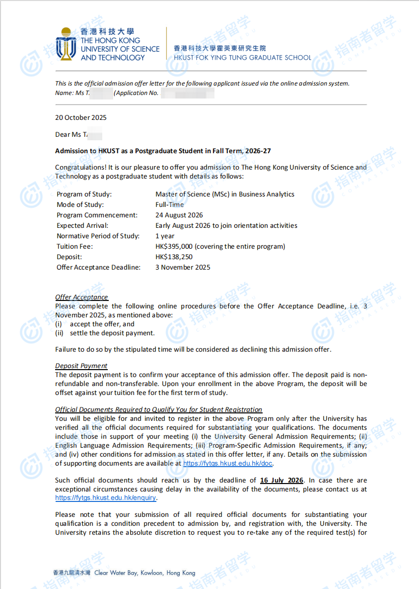 香港科技大学商业分析理学硕士研究生offer一枚