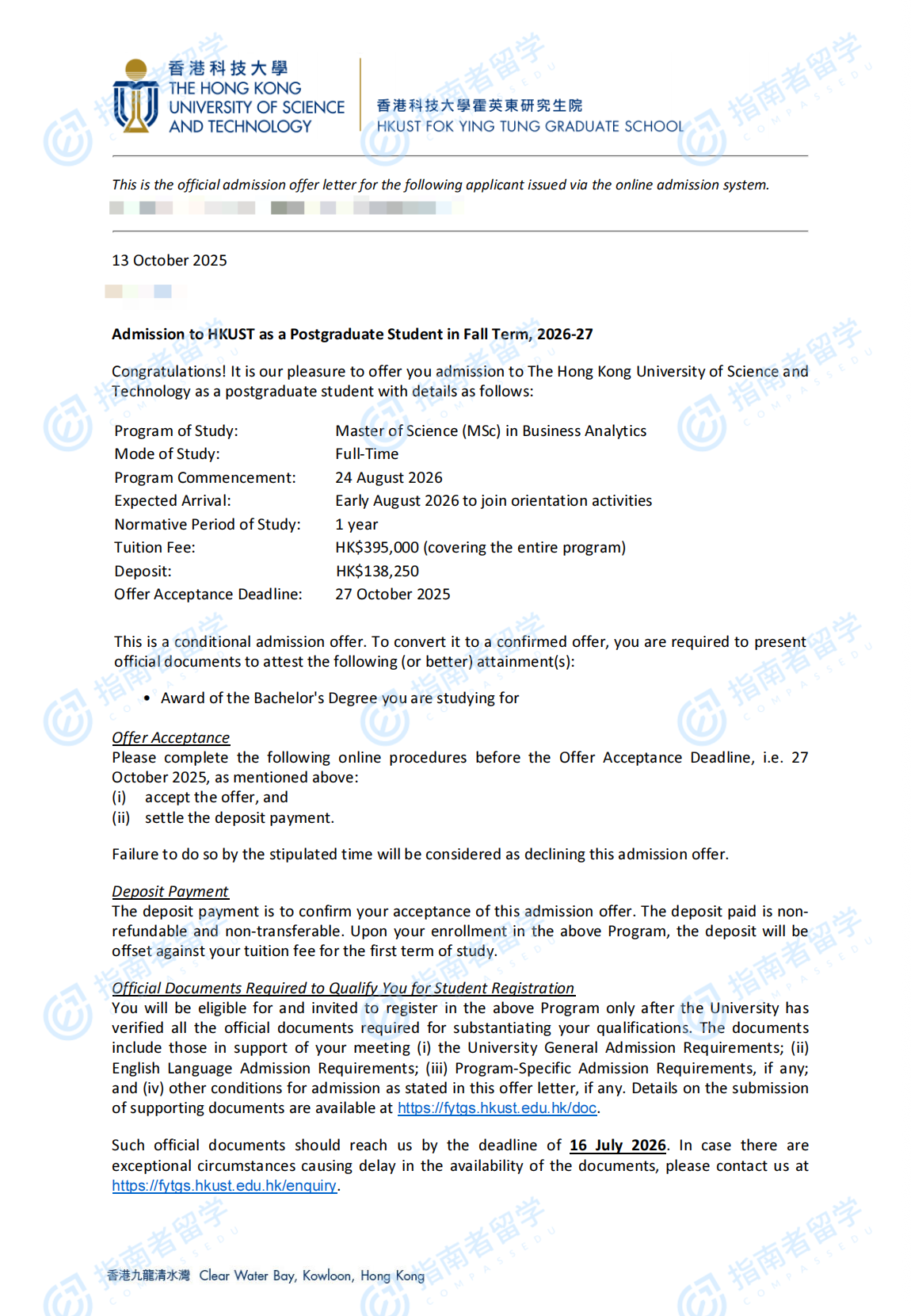 香港科技大学商业分析理学硕士研究生offer一枚