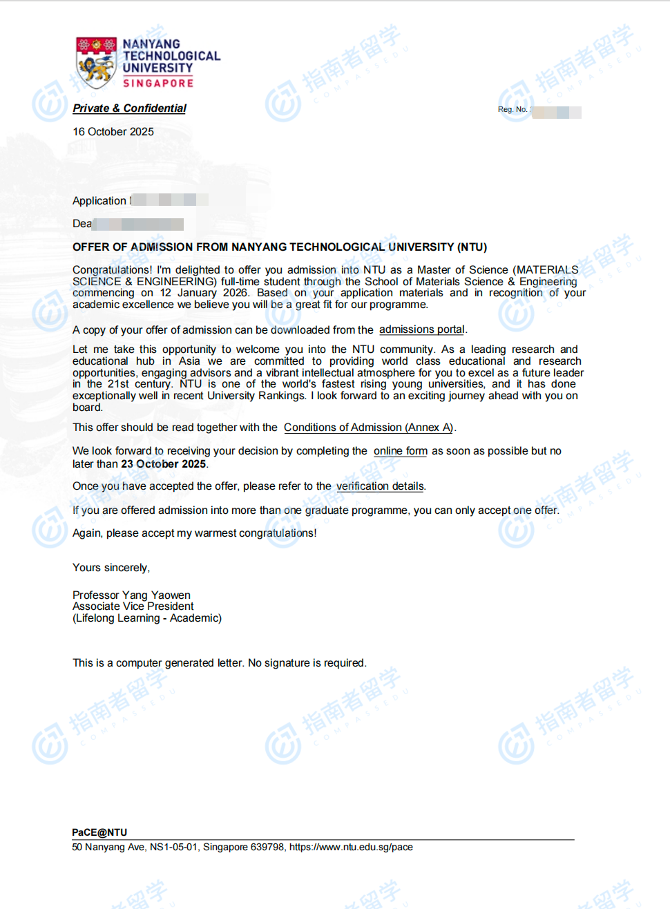 南洋理工大学材料科学与工程理学硕士研究生offer一枚