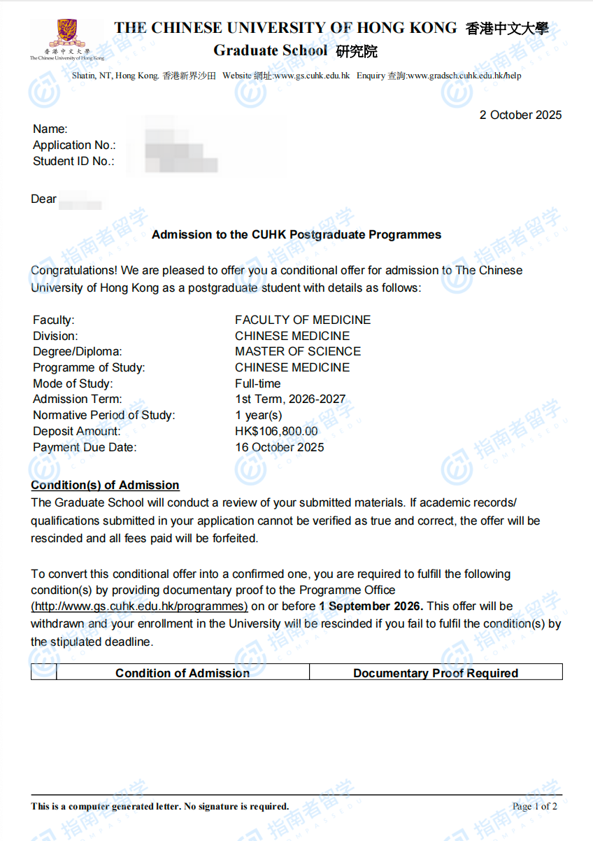 香港中文大学中医学理学硕士(中医全科专修)研究生offer一枚