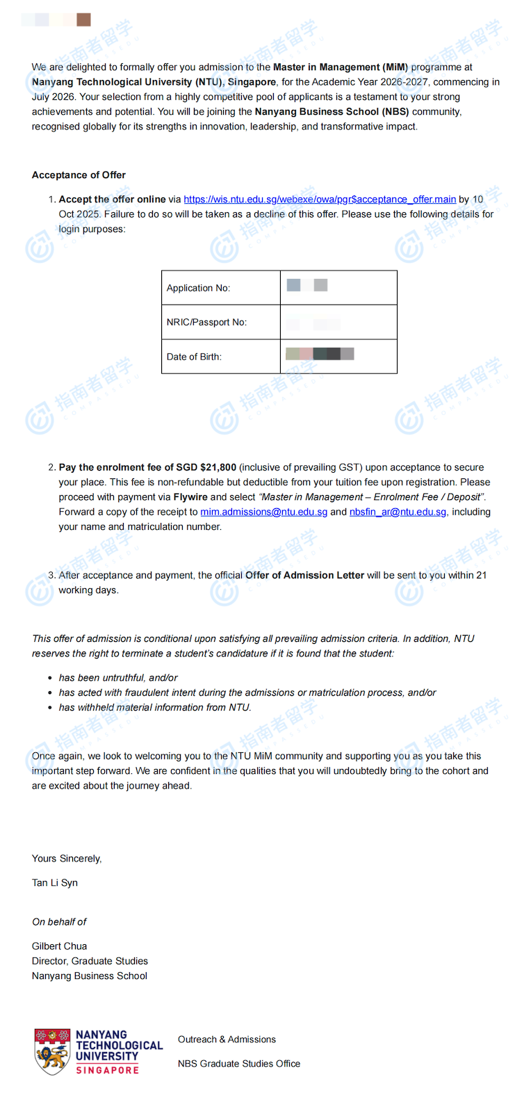 南洋理工大学管理经济学理学硕士(中文授课)研究生offer一枚