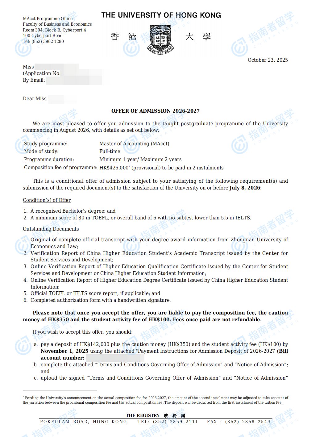 香港大学会计学硕士研究生offer一枚