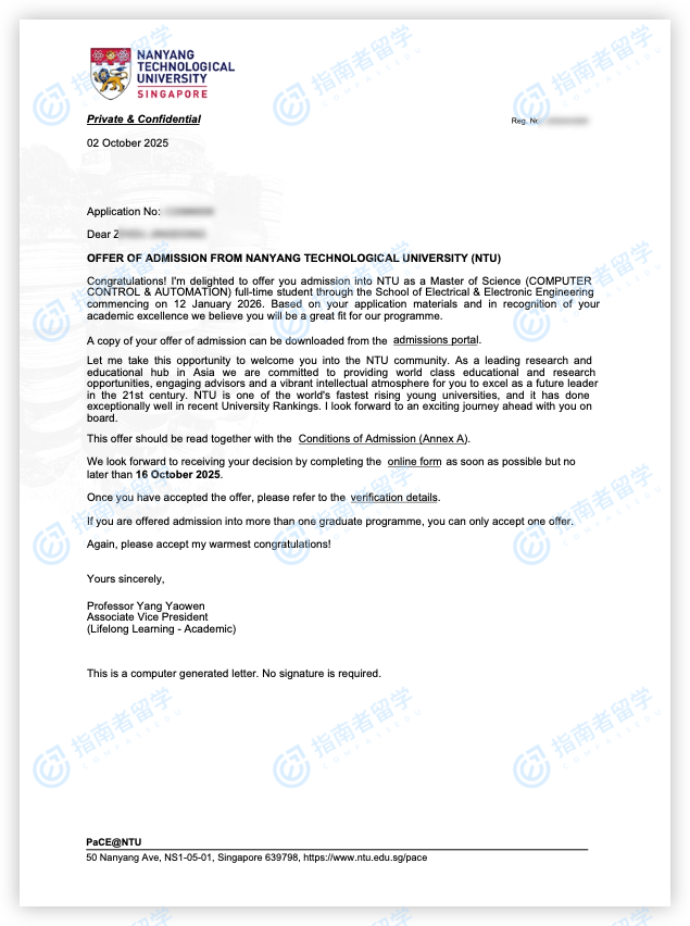 南洋理工大学计算机控制与自动化理学硕士研究生offer一枚