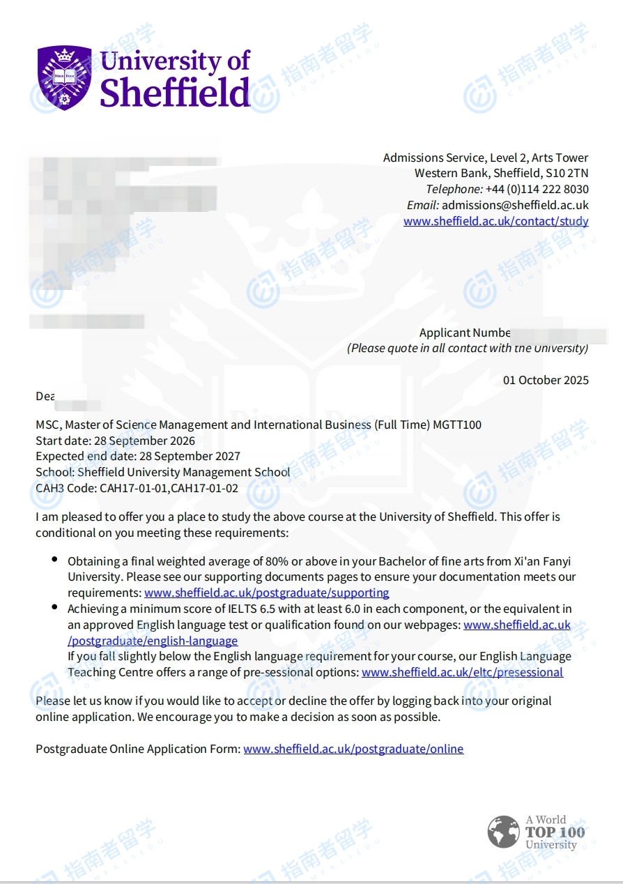 谢菲尔德大学管理学与国际商务理学硕士研究生offer一枚