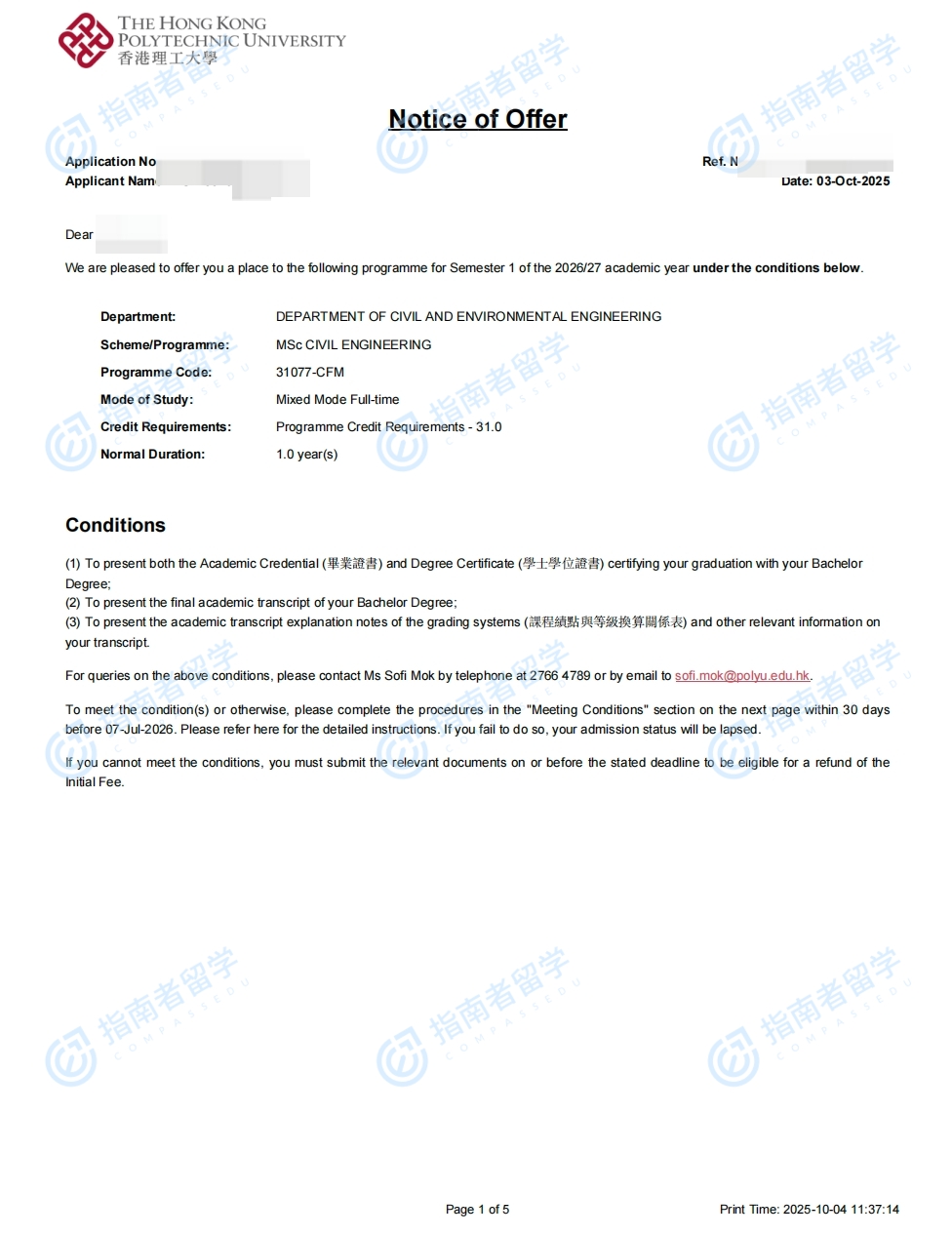 香港理工大学土木工程学理学硕士研究生offer一枚