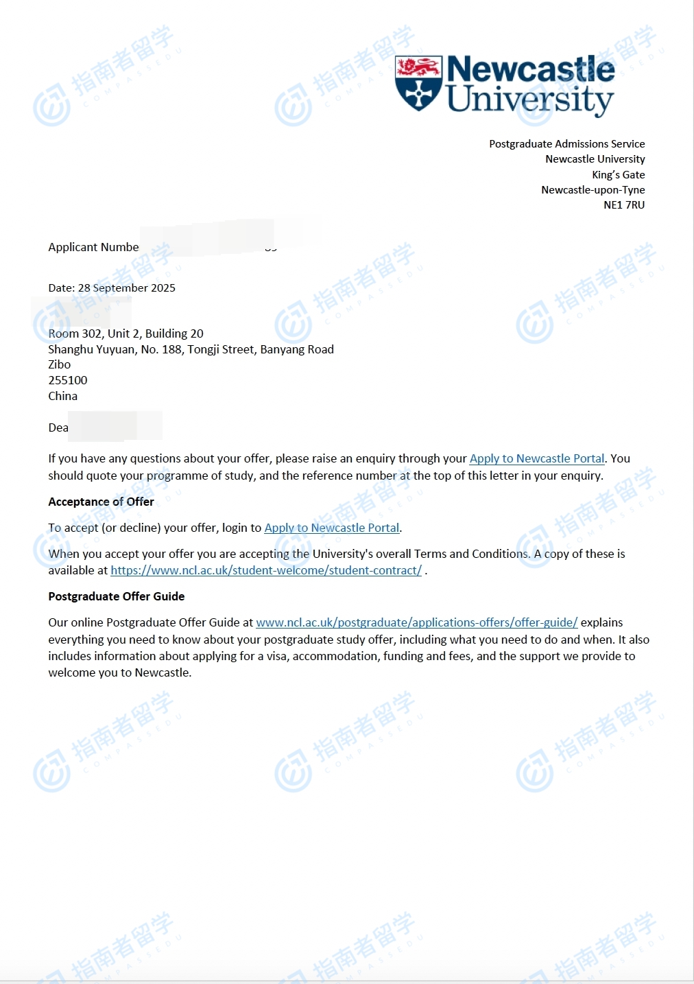 纽卡斯尔大学(英国)自动化与控制理学硕士研究生offer一枚