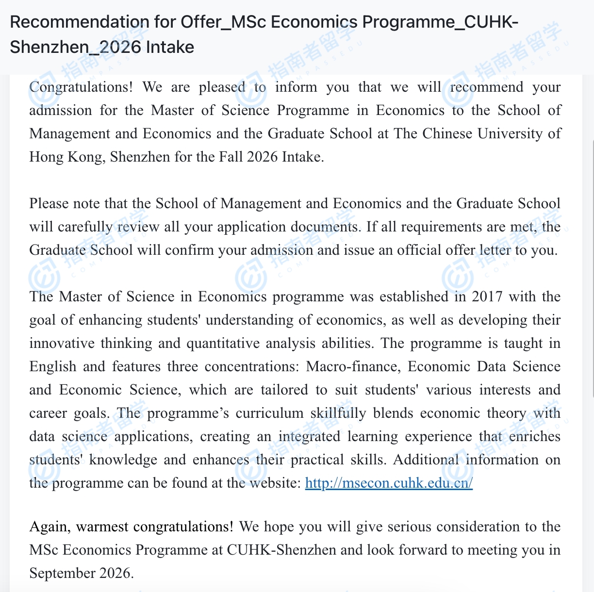 香港中文大学经济学理学硕士(CUHK-Shenzhen)研究生offer一枚