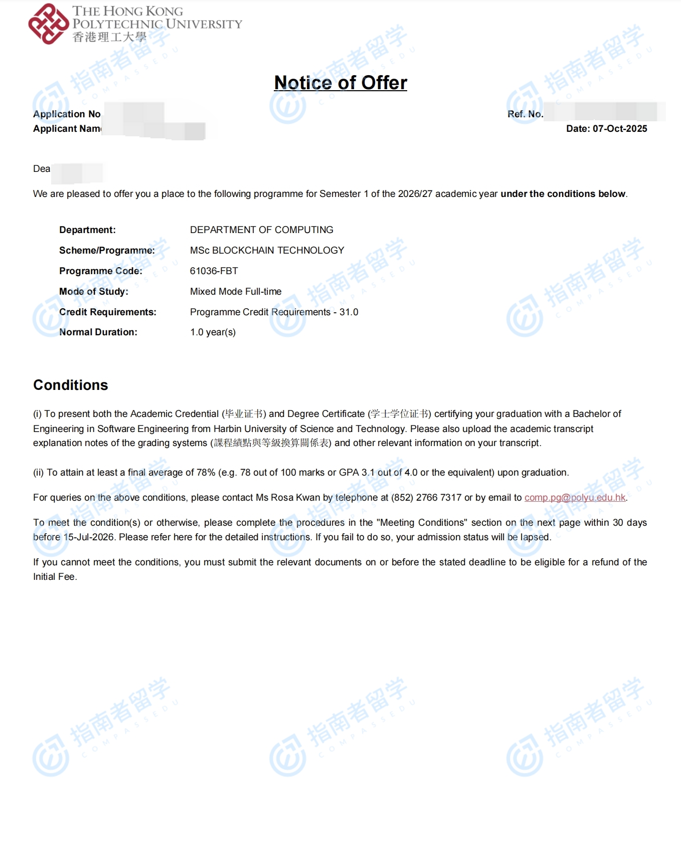 香港理工大学区块链科技理学硕士研究生offer一枚
