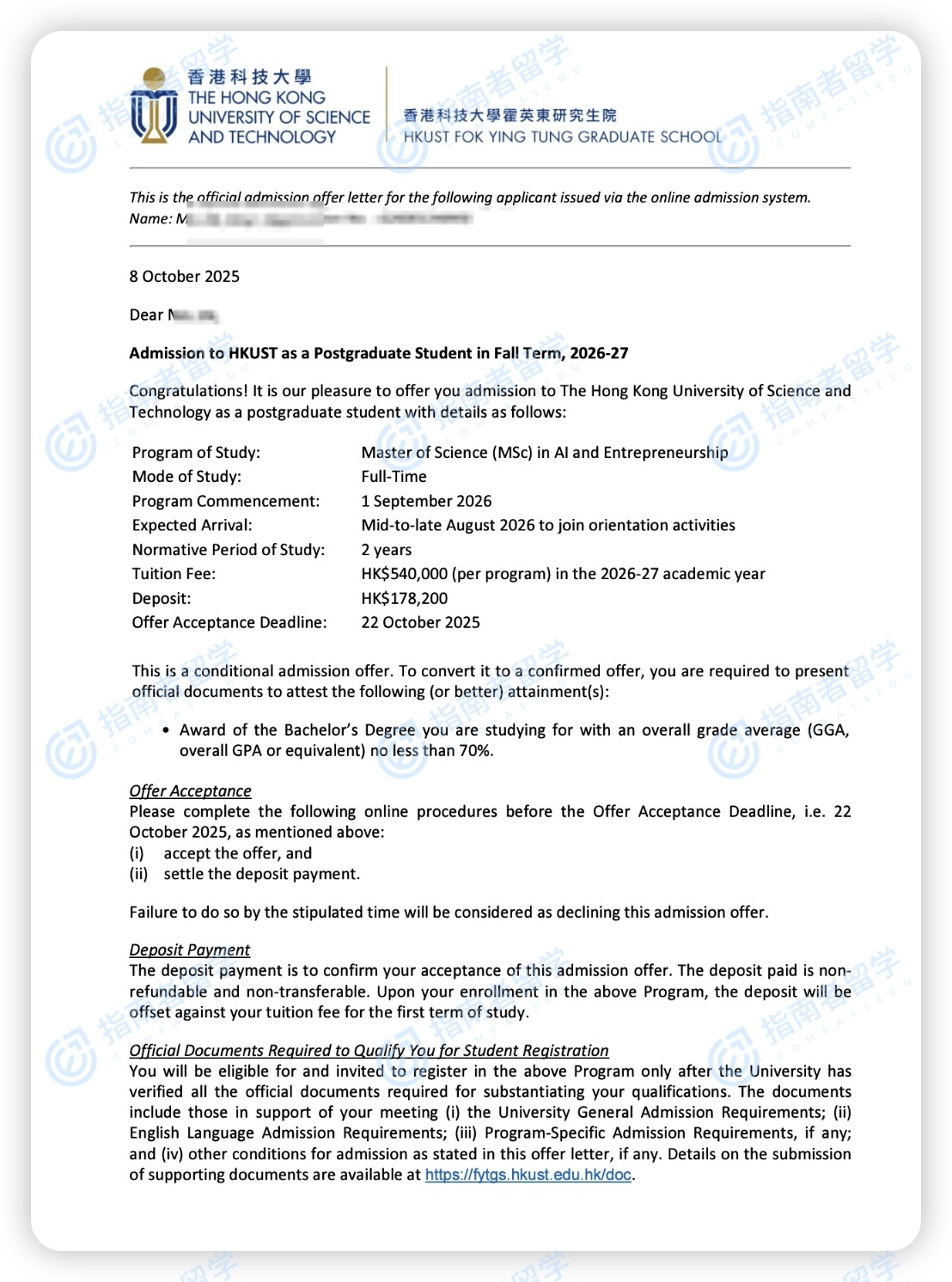 香港科技大学人工智能与创业理学硕士研究生offer一枚