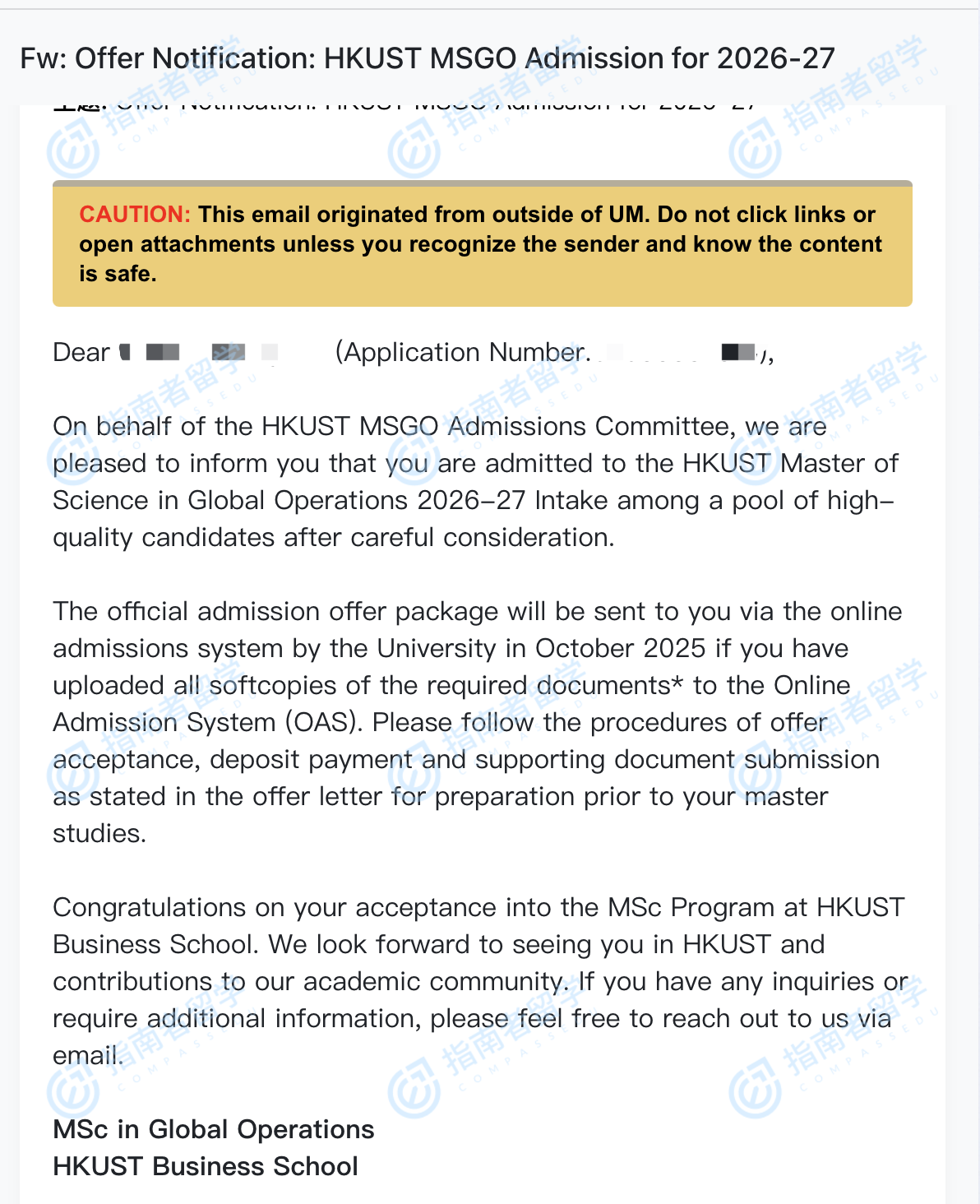 香港科技大学全球运营理学硕士研究生offer一枚