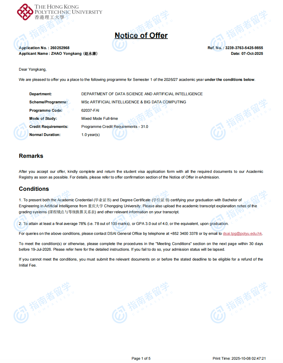 香港理工大学人工智能及大数据计算理学硕士研究生offer一枚