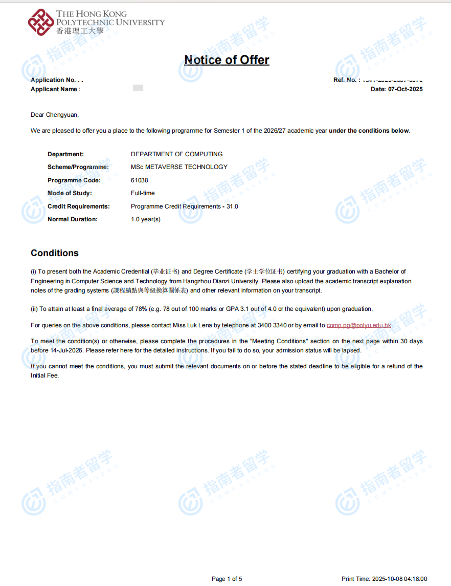 香港理工大学元宇宙科技理学硕士研究生offer一枚