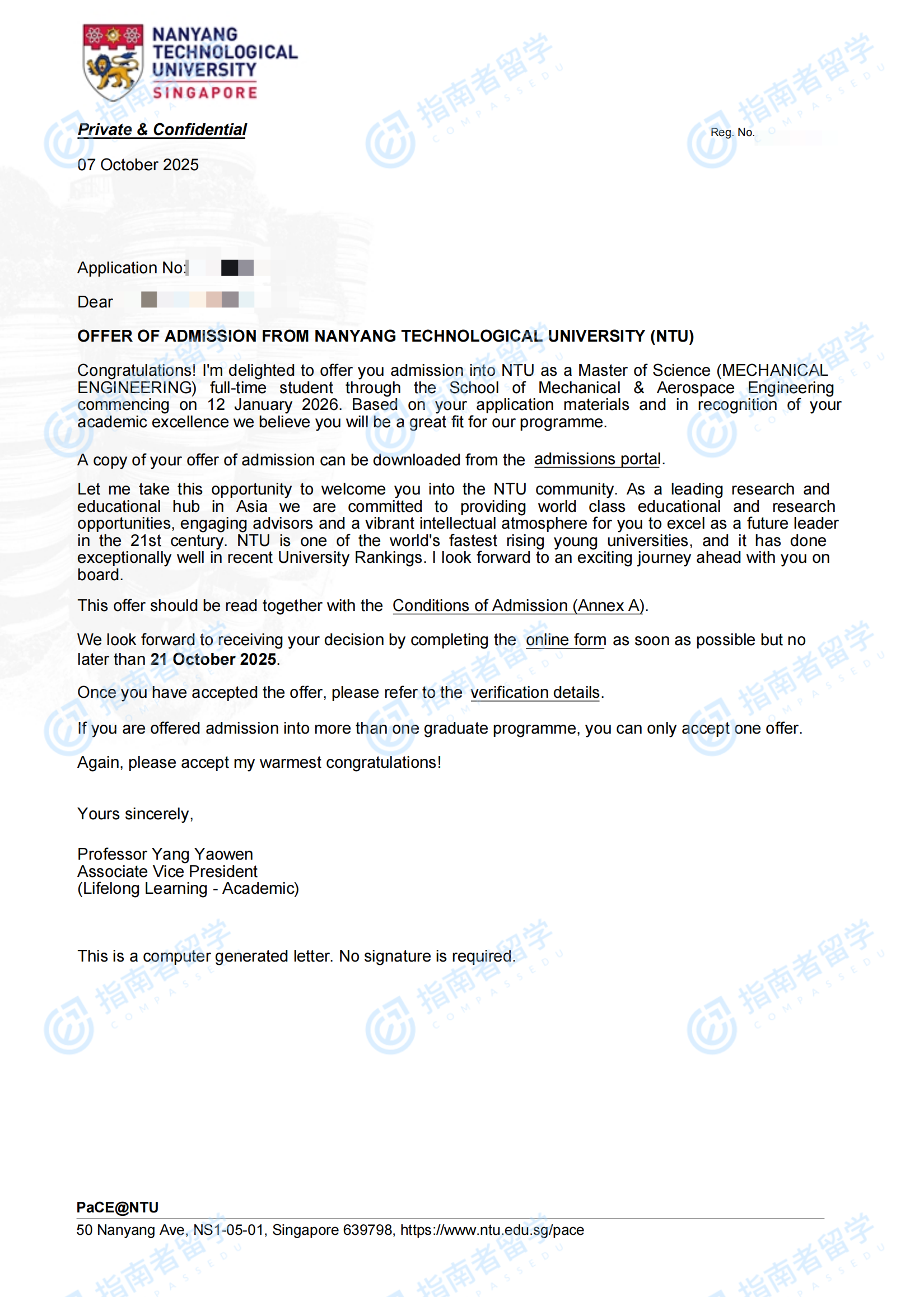 南洋理工大学机械工程理学硕士研究生offer一枚