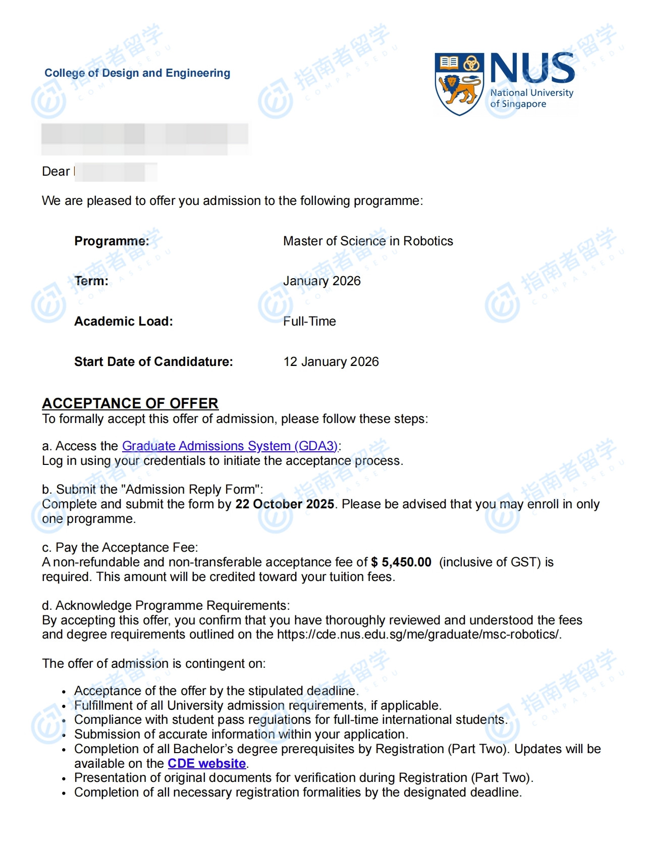 新加坡国立大学机器人学理学硕士研究生offer一枚