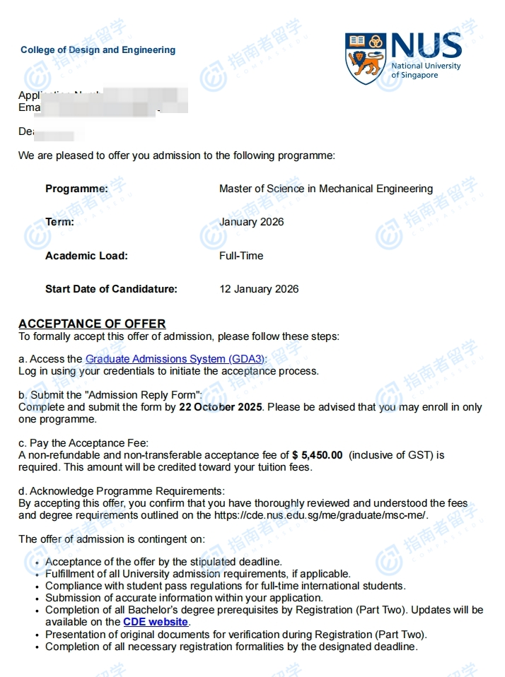 新加坡国立大学机械工程理学硕士研究生offer一枚