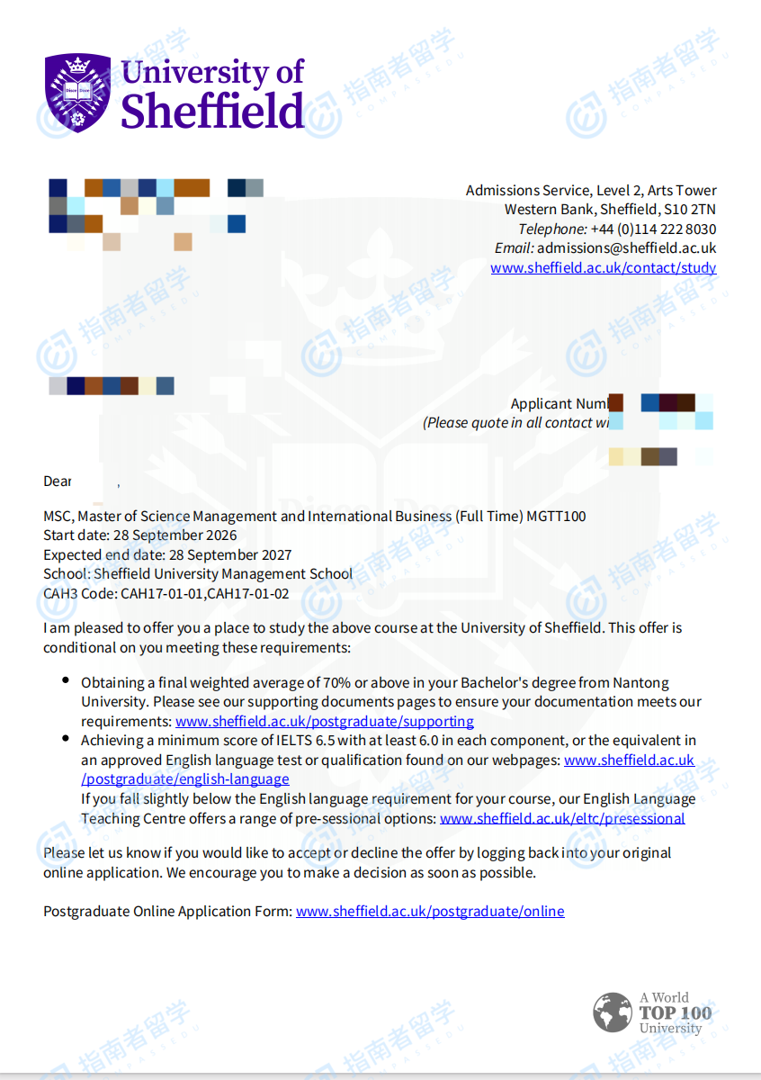 谢菲尔德大学管理学与国际商务理学硕士研究生offer一枚