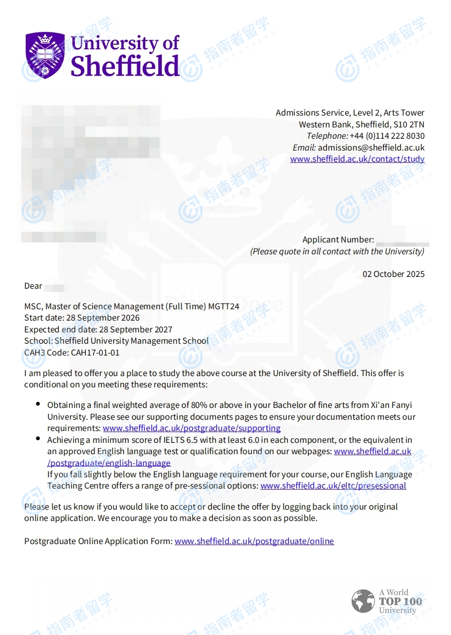 谢菲尔德大学管理学理学硕士研究生offer一枚