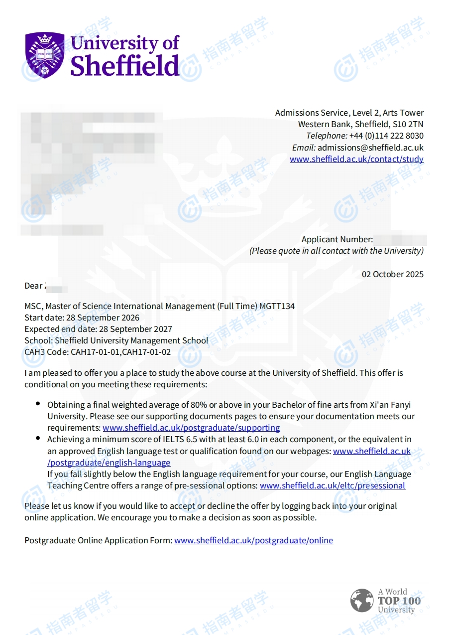 谢菲尔德大学国际管理理学硕士研究生offer一枚
